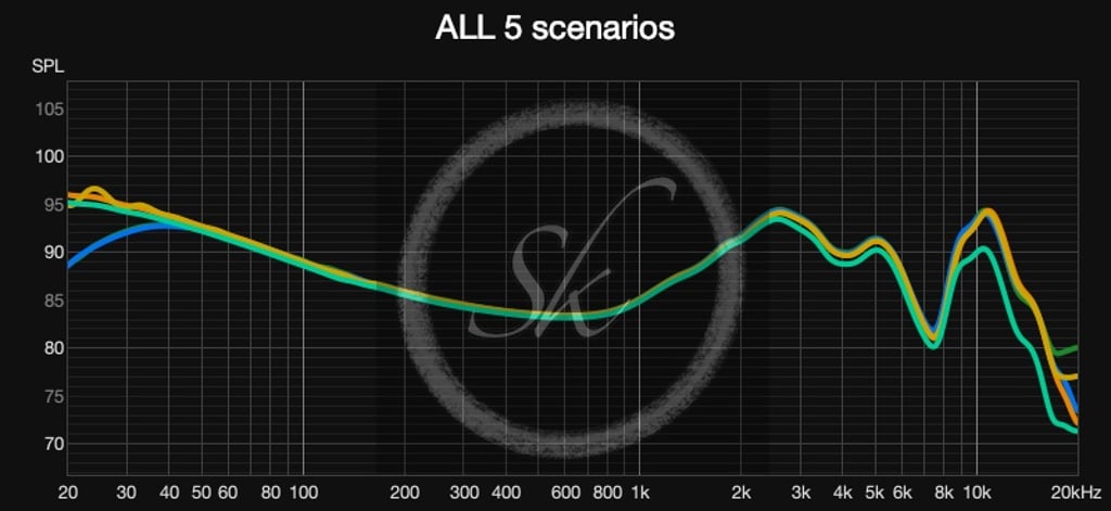 I compared the average curves from the left and right measurements in each scenario, smoothed by 1/6 and normalized at 85 dB for 1 kHz.