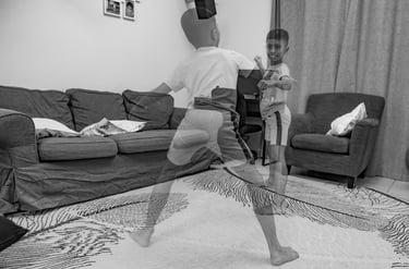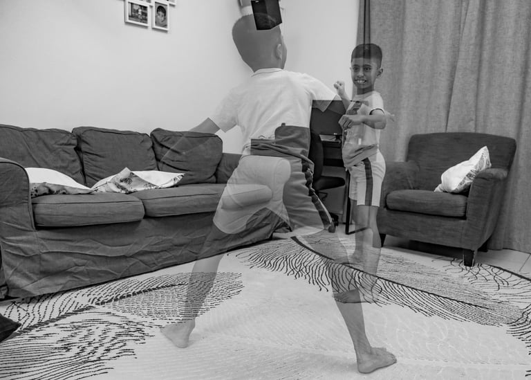 Was experimenting with multiple exposures and asked my son to pose for some photos. After we had taken some photos he came up with an idea of a picture in which he is fighting with himself. We experimented and this is one of the pictures in this series...