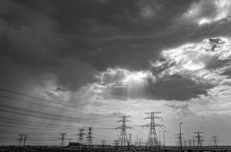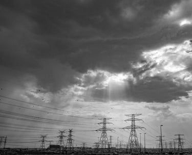 While driving to the office noticed light shining through the clouds making an interesting pattern in the sky. The electrical transmission towers formed a silhouette that attracted my attention, when I stopped at the nearest traffic signal was able to capture the scene...