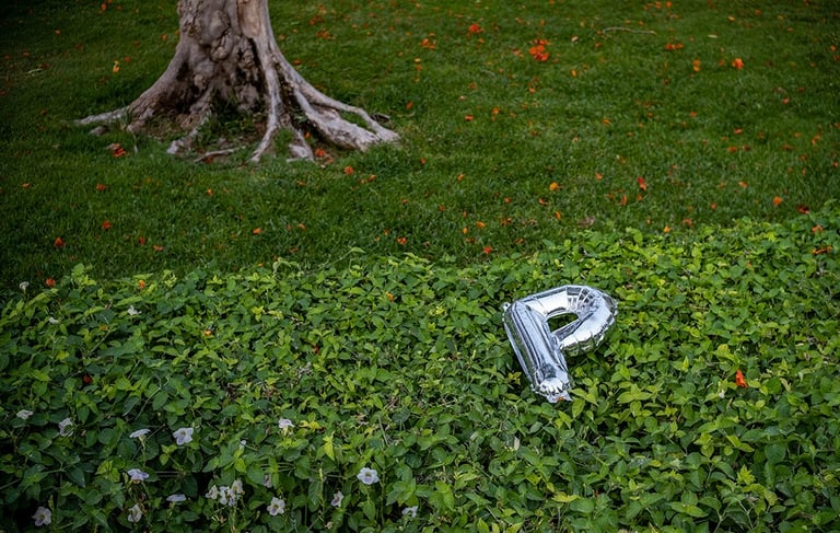 Was at a nearby park on Sunday morning and noticed that a corner grass area of the park was filled with leftovers from a possible party that was held there earlier... the air-filled letter P was on the nearby bush near the tree in the area. The silver P on the green bush with green background grass and the grass and the bush had sprinkles of flowers so the scene caught my attention .....