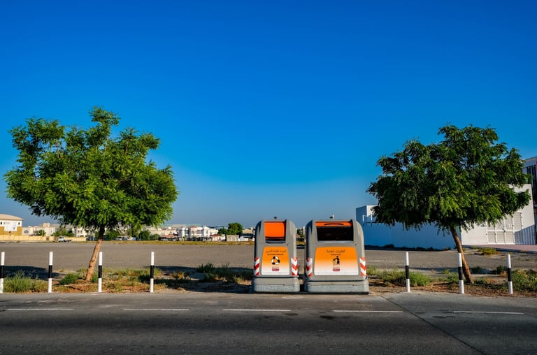 While driving down one of the residential areas noticed that one side of the road was lined with waste bins with orange lids, these bins were placed in between two neem trees. This set caught my attention as this was the only pair with one bin door open so decided to capture the view...